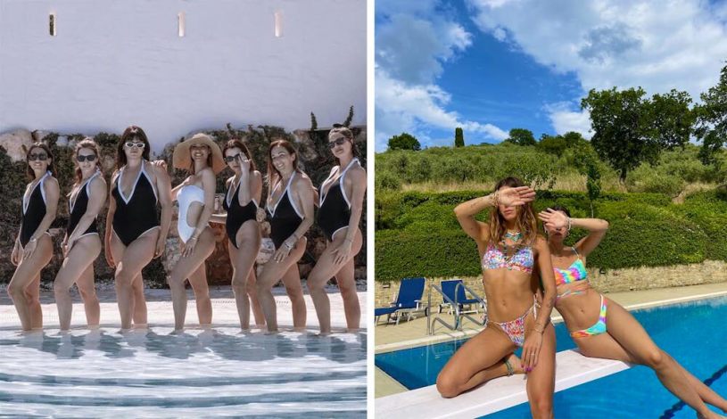 Beatrice Valli sceglie Calzedonia per il suo addio al nubilato rilassandosi in piscina con un costume intero cut out bianco abbinato a quello delle amiche.