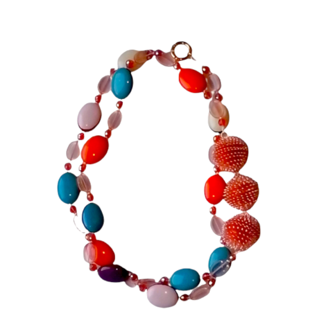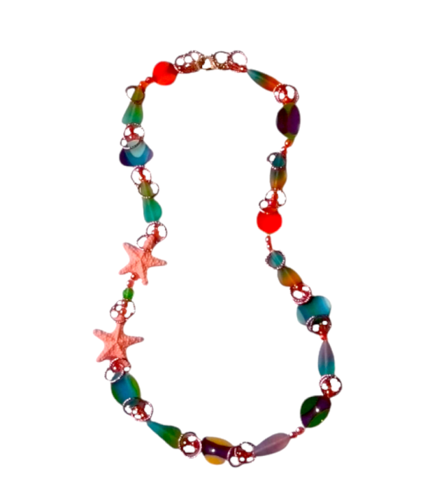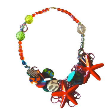 la collana vedette, quella che racchiude in sè lo spirito ed i colori della collezione, caratterizzata da questo corpo centrale con due enormi stelle marine accompagnate da vari elementi, coloratissimi, di forme e dimensioni diverse.