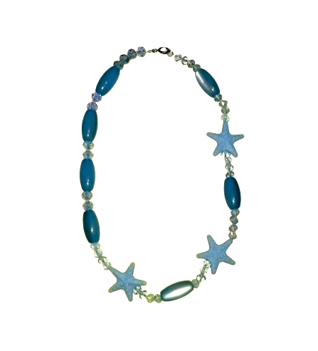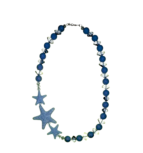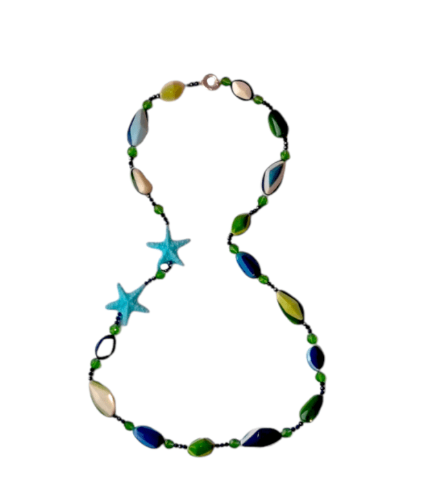elementi tubolari dal tono blu intenso con striature bianche e tanti piccoli elementi trasparenti che ricordano i circa 400 gradini che bisogna percorrere per arrivarci, che si fondono e combinano con stelle marine in una collana corta ma dall’insieme unico, così come unica è la spiaggia da cui prende il nome.