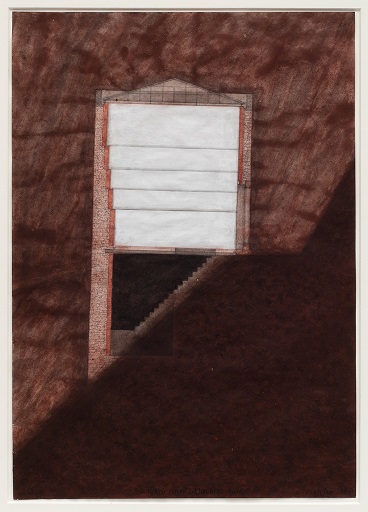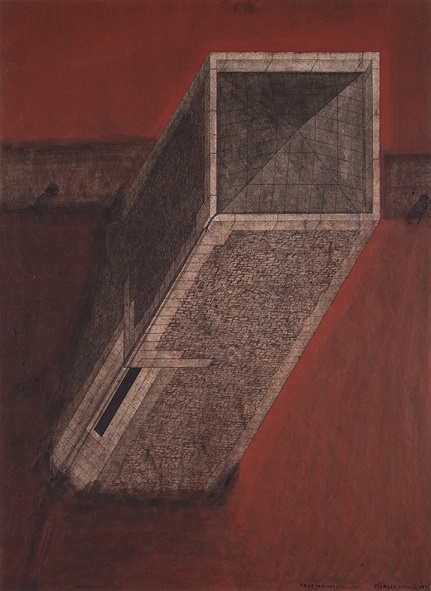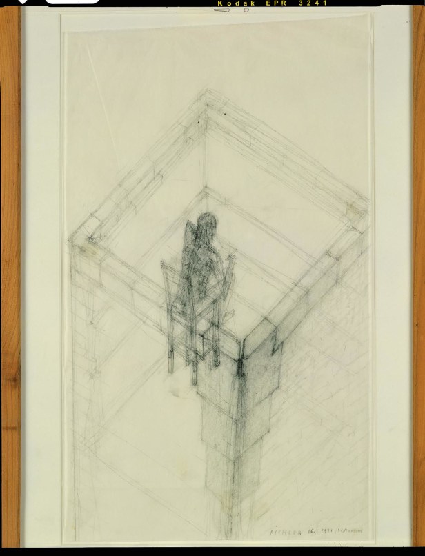 In mostra un corpus di 11 disegni appartenenti alla Collezione Museion, il ciclo Haus in der Schlucht (casa nella gola della valle) del 1991, in cui l’artista sviluppa l’idea di costruirsi una torre nella Gola dell’Eggenbach, che, causa della ristrettezza della gola, sarebbe stata illuminata solo dall’alto.