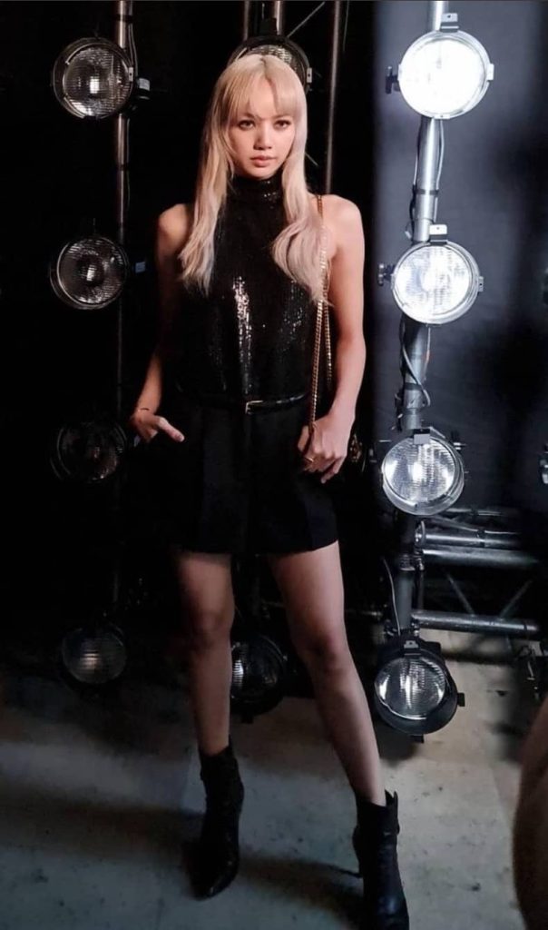 La cantante Lisa top nero aderente al collo con pailettes e pantaloncini in pelle nera abbinati a stivali a punta con tacco alto.