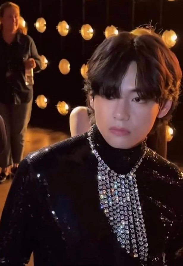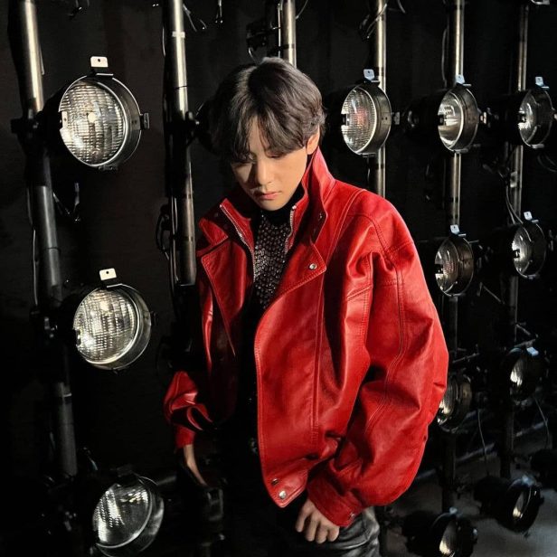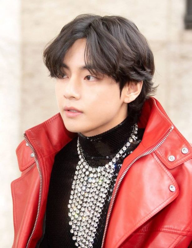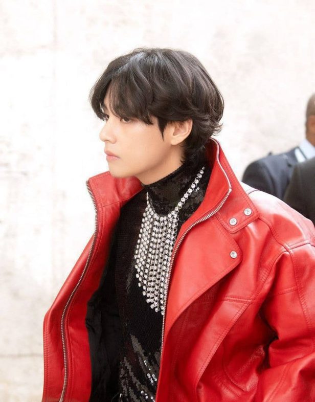 Il popolare membro dei BTS, V aka Kim Taehyung indossava una maglietta a polo con pailettes abbinata a pantaloni in pelle e una giacca rossa lasciata aperta per incorniciare i gioielli OTT.