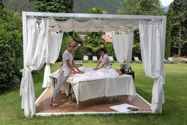 Il Lido Palace di Riva del Garda (TN), raffinato 5 stelle incorniciato dal Lago di Garda e dalle montagne, nel gazebo immerso nel parco secolare, con i suoni dell’acqua a fare da colonna sonora, propone l’esclusivo Open air massage. Il massaggio con oli pregiati biologici certificati, è studiato per donare equilibrio a tutto il corpo. Prezzo di 110 euro a persona per 45 minuti e di 220 euro in coppia (Tel. 0464 021899, www.lido-palace.it).