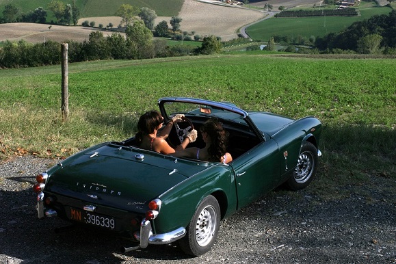 Sensazioni fuori dal tempo, accomodati romanticamente su una scintillante Triumph Spitfire, indossando occhialoni da diva e guanti vintage.
