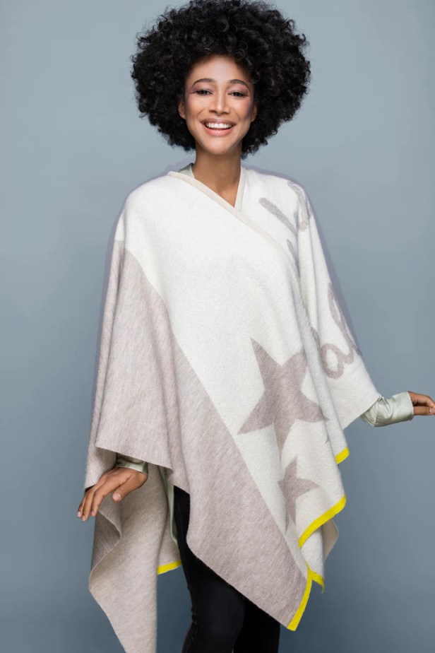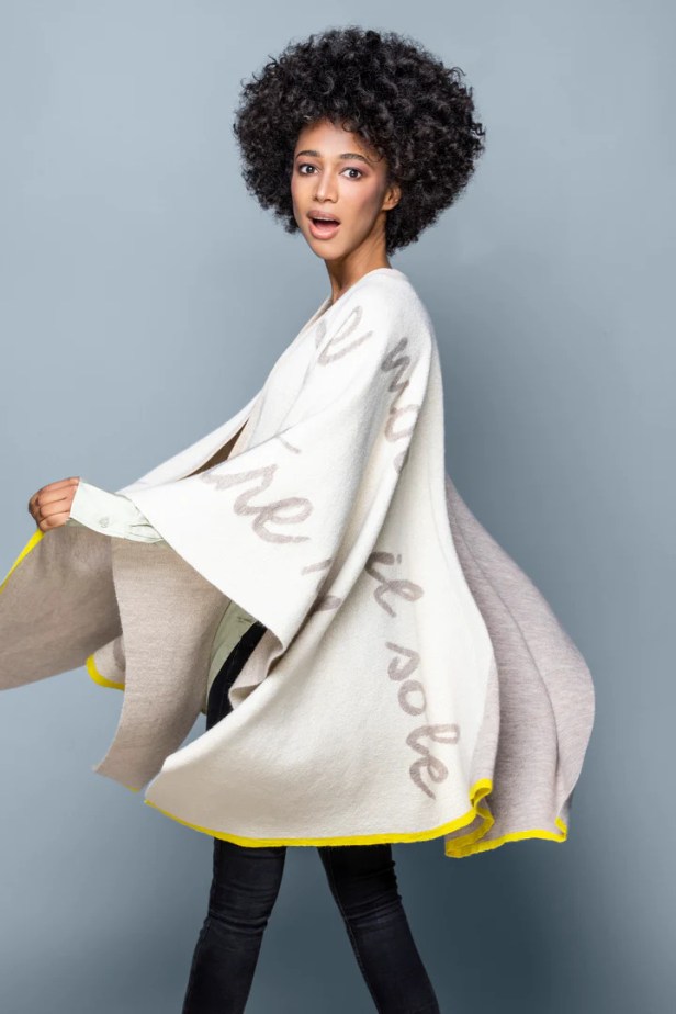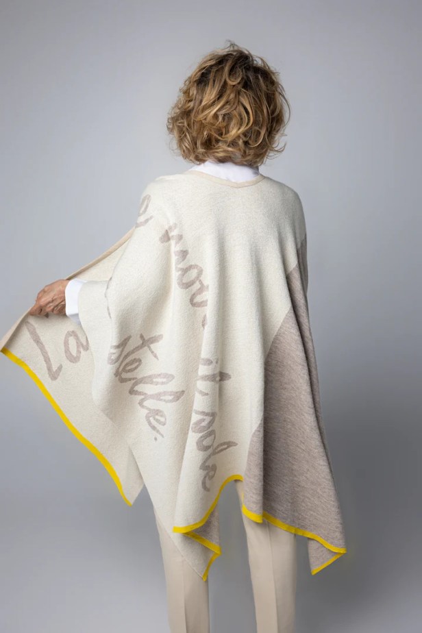 Questa avvolgente mantella, che richiama il disegno sulla copertina baby, può essere indossata con tutti i look.