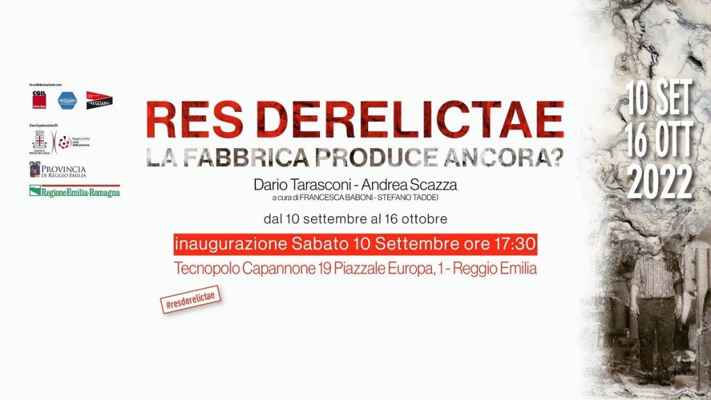 All’interno del Tecnopolo di Reggio Emilia, che ha sede nel Capannone 19 delle storiche Officine Meccaniche Reggiane, sarà allestita “RES Derelictae. La fabbrica produce ancora?“, mostra dei giovani artisti Dario Tarasconi e Andrea Scazza che si propone di portare all’attenzione del pubblico l’estrema contemporaneità di quella che è stata una delle realtà industriali più importanti in Italia. Luogo di produzione e di socialità, di degrado e di abbandono, di innovazione e cultura, la fabbrica è ancora oggi capace di arricchire l’immaginario di una città che osserva se stessa in divenire, riconoscendo la bellezza nell’imperfezione.