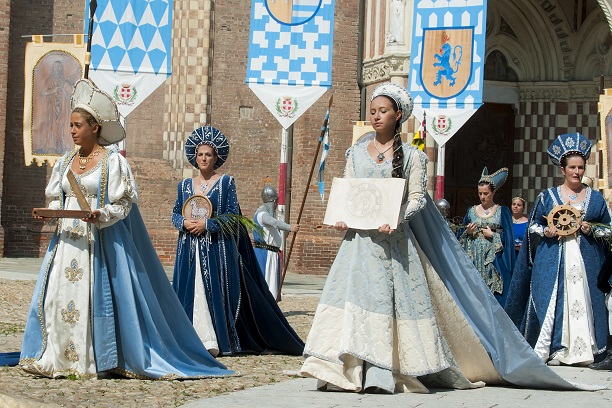 I costumi, fedeli riproduzioni d’epoca, sono realizzati dalle sartorie teatrali e si ispirano a dipinti e affreschi di età medievale. La sfilata è il frutto di un lavoro minuzioso e certosino per trovare tessuti, fogge e accessori, acconciature e attrezzature storicamente coerenti.