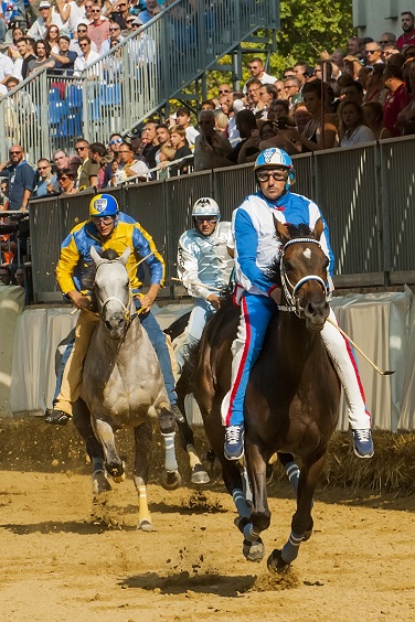 21 fantini in sella ad altrettanti cavalli si sfidano per aggiudicarsi l’ambitissimo drappo del Palio. La corsa è regolata dal Mossiere che, da un podio, chiama i partecipanti alla batteria e quando giudica regolamentare l’allineamento, fa cadere il “canapo”, una grossa corda lunga circa 15 metri e pesante quasi un quintale.
