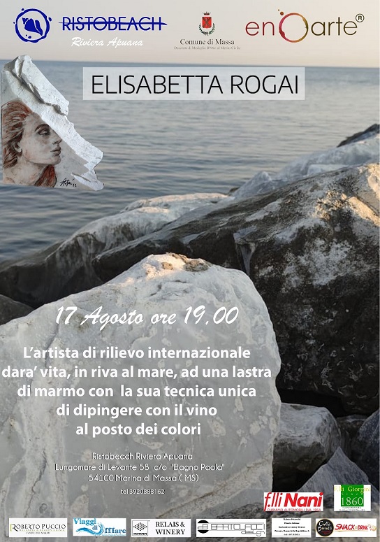 In riva al mare, 17 agosto, performance live di Elisabetta Rogai. Partner: RistoBeach di Stefano Fassina e F.lli Giorgini Marmo. Da una idea di Stefano Fassina, chef Gourmet del RistoBeach della Riviera Apuana, condivisa dalla dottoressa Nadia Marnica, Assessore alla Cultura del Comune di Massa.