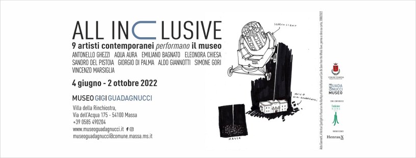 Al Museo Guadagnucci di Massa (MS) prosegue, fino al 2 ottobre 2022 (è stata inaugurata il 4 giugno scorso), la mostra “All Inclusive. Nove artisti contemporanei performano il museo”, curata da Cinzia Compalati con opere di Aqua Aura, Emiliano Bagnato, Eleonora Chiesa, Sandro Del Pistoia, Giorgio Di Palma, Antonello Ghezzi, Aldo Giannotti, Simone Gori, Vincenzo Marsiglia.