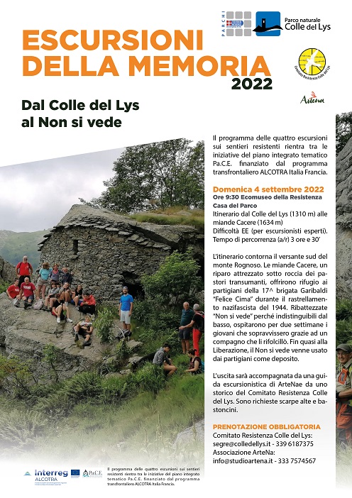 Ad inizio settembre si concludono per l’anno 2022 le “Escursioni della memoria” organizzate dal Comitato Resistenza Colle del Lys in collaborazione con la Città metropolitana di Torino nell’ambito del piano tematico Pa.C.E., di cui la Città metropolitana di Torino è partner, finanziato dal programma transfrontaliero Alcotra Italia Francia.