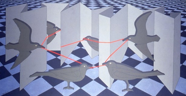 La mostra prosegue al secondo piano con la sala dedicata ad una serie di opere dipinte ad acrilico dove i soggetti vengono raffreddati e sospesi come in “Labirinto di carta” del 1984, e infine nell’ultima sala arriviamo alla produzione più recente caratterizzata dal ritorno alla pittura ad olio, che gli permetteva vibrazioni cromatiche e materiche più liriche, come nel poetico “Sette barche e tre pesci” del 2010.