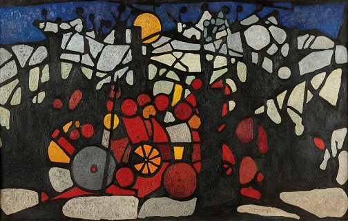 Nella prima sala di Palazzo Lomellini sono esposte le opere degli anni ’50, come la visionaria “Torre di Babele” del 1952, metafora della guerra, dell’incapacità degli uomini di comprendersi, dipinta da Francesco Casorati appena diciottenne, eppure opera di un artista già maturo, informato, colto, come ricorda la curatrice.