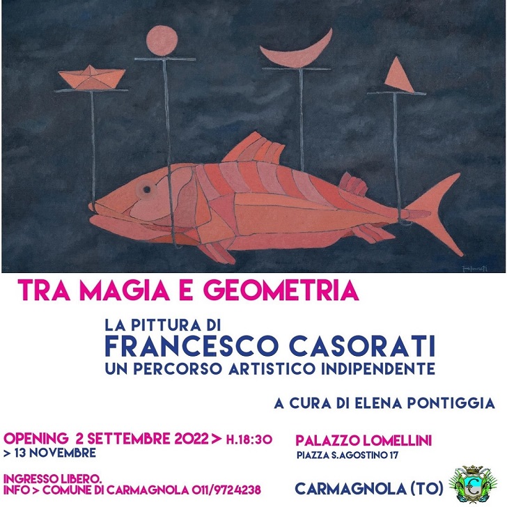 Francesco Casorati “Tra magia e geometria” Palazzo Lomellini – Carmagnola dal 2 settembre al 13 novembre 2022 Palazzo Lomellini, piazza S.Agostino 17, Carmagnola (TO). Info Comune di Carmagnola 011/9724238. Vernissage a ingresso libero venerdì 2 settembre alle 18,30 a Palazzo Lomellini Orario dal 2 all'11 settembre: dal lunedì al venerdì 20,30-23; sabato e domenica 15,30-18,30 e 20,30-23. Orario dal 12 settembre al 13 novembre: giovedì, venerdì e sabato 15,30-18,30, sabato e domenica 10,30-12,30 e 15,30-18,30. Ingresso libero.