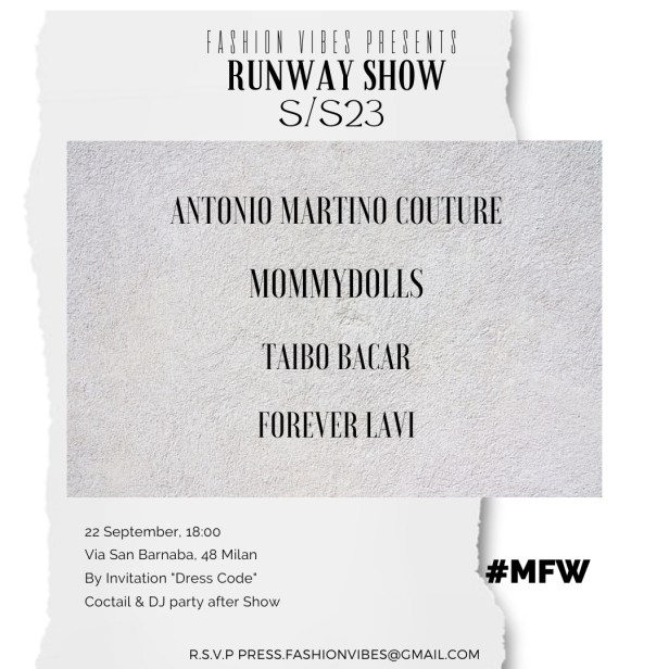 Sfilate il 22 settembre alle ore 18 per la Fashion Vibes nella splendida location della Società Umanitaria di importanti brand: gli italiani Antonio Martino Couture e MommyDoll, Taibo Bacar dal Mozambico e Forever Lavi by Mariano Feliciano direttamente da Miami.