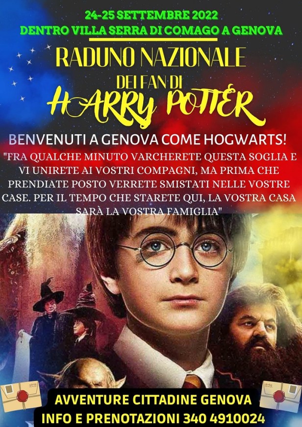 Il 24 e il 25 settembre si terrà la tanto attesa seconda edizione del RADUNO NAZIONALE #GenovacomeHogwarts nella splendida Villa Serra di Comago, in cui, ad attendere gli studenti in divisa magica, ci saranno oltre a tutti i personaggi, Edvige e i gufi di Hogwarts con Terra di Confine, la cerimonia dello smistamento con il Cappello Magico, la lezione con Harry Potter di Accademia delle Arti Magiche con la boutique di Olivander, e poi lezioni di erbologia, la degustazione di pozioni di Spirits’House e Severus Piton, e molto altro! Per prenotare il proprio posto e trovare tutte le informazioni puoi cliccare sul seguente link.