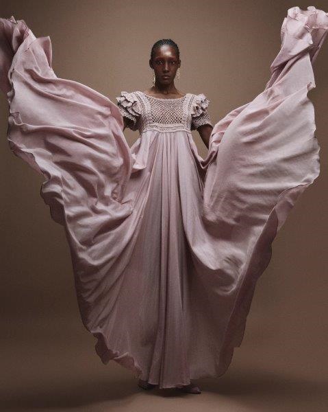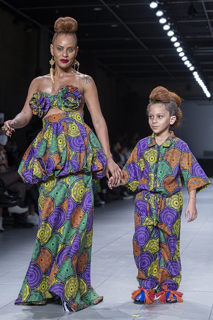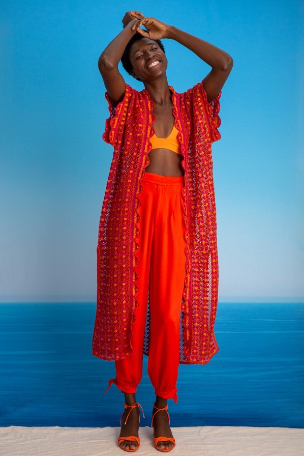 Volumi, trame e tanta opulenza sono le idee alla base della costruzione dei pezzi presentati nella collezione “Meu Ori é a minha voz” (Il mio Ori è la mia voce), che allude a re e regine del continente africano, definita da colori vivaci di stampe e motivi. Il tessuto dalle trame africane continua a essere protagonista dello stile del brand insieme al patchwork. La novità di questa collezione è il lancio delle stampe, che rappresentano i princìpi e parlano della storia del Paese. Le stampe sono state ideate e firmate da Hori, designer di Estúdio Agá a Bahia. Le scarpe sono di produzione artigianale a opera della Lucas Lemos del marchio Tsuru, di Sergipe. I marsupi, le borse, le bucket bag e le pochette sono stati disegnati da Vinícius Carmezim del marchio Ziê, di Bahia. I balangandã e le corone sono stati forniti dall’istituzione religiosa Ile Dé Odé. Il concetto alla base del design delle collane è stato sviluppato da Kelba Deluxe e gli orecchini e gli anelli sono stati disegnati da Luana Rodrigues, designer di Bahia.