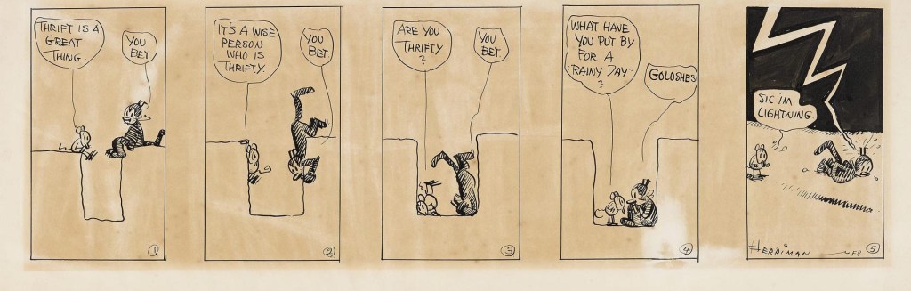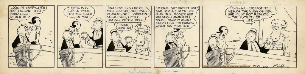 Ma saranno presenti opere di altri 25 Maestri che hanno dato forma a quest’arte in continua evoluzione, da Elzie Chrisler Segar (1894-1938), creatore di Popeye – Braccio di ferro, a Floyd Gottfredson disegnatore dei primi fumetti di Mickey Mouse – Topolino, da Otto Soglow con la striscia The Little King, amata da Vladimir Nabokov, alla curiosa striscia disegnata dal pugile Primo Carnera, da Otto Mesmer con Felix the Cat, su cui scrisse Italo Calvino, a autori molto amati anche in Italia come Chester Gould con Dick Tracy, Al Capp con Lil’ Abner e Milton Caniff, prima fonte di ispirazione di Hugo Pratt. E ancora: Frederick Burr Opper, Billy DeBeck, Richard Felton Oucault, James Swinnerton, Rudolph Dirks, Harold Knerr, Geo McManus, Bud Fisher, Carl B. Williams, Gene Byrnes, Harry J. Tuthill, Henry Bushmiller, Rube Goldberg, Dick Calkins, Basil Wolverton, Lyman Young, Ham Fisher.