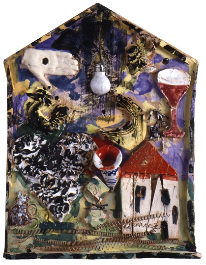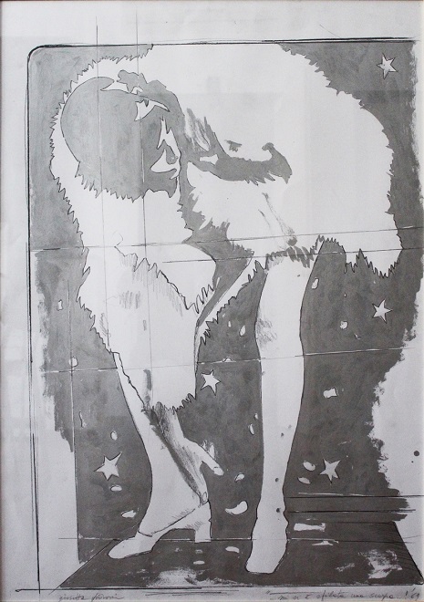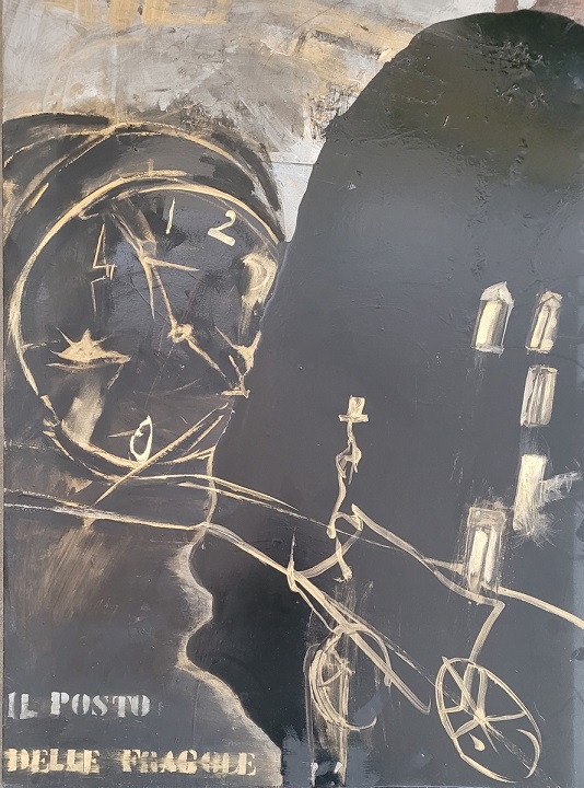 «Lo scenario dell’universo visivo di Fioroni – scrive Gemma Gulisano, curatrice della Fondazione Goffredo Parise e Giosetta Fioroni – è il Teatrone. Presentato in occasione della XLV Biennale d’Arte di Venezia del 1993, oggi ospita vecchi e nuovi lavori che l’artista dispone come dentro una vetrina che affaccia sul divano del proprio studio. Tra i teatrini di cartone, quelli di ceramica, i disegni fissati al grande teatro e i dipinti appesi o accostati alle pareti, un’opera di grandi dimensioni cattura lo sguardo di molti: Ramo d’oro. Due tronchi, disposti come colonne di un portale architettonico, aprono un varco su un sentiero non ancora tracciato; lo sfondo si smaterializza lasciando convergere lo sguardo dello spettatore su un piccolo dettaglio che sporge alla base del pannello, una casetta. Eseguita nel 2014 durante una collaborazione artistica con la maison Valentino, l’opera venne selezionata dalla stilista Maria Grazia Chiuri per un video girato con l’artista. Avvolto nel pluriball, Ramo d’oro si prepara a lasciare lo studio e la città capitolina per raggiungere le sale del Centro d’Arte Moderna e Contemporanea della Spezia. Tutto è quasi pronto per festeggiare un’artista senza apostrofo, come la stessa Fioroni ama definirsi, con un’antologica a lei dedicata».
