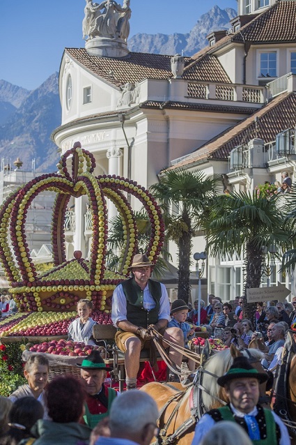 Tra i più importanti il carro di Marlengo con la corona di mele, realizzato nel 1949, il più antico della Festa dell’Uva; impressionanti le sue dimensioni: lungo oltre 5 metri e largo 2,20 metri, pesa 2,3 tonnellate (delle quali più di 500 chili sono dovuti al peso delle mele).