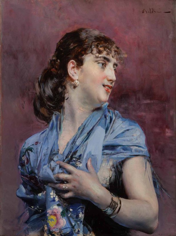 L’eleganza, la raffinatezza e l’internazionalità del milieu artistico pariginofanno da sfondo anche ad un inedito acquerello, L’atelier dell’artista, databile al 1874 circa; una natura morta di oggetti abilmente composta sul pavimento di uno studio. L’ambientazione dell’atelier è rievocata nel noto Ritratto del pittore Joaquin Araujo y Ruano, collega e amico di Boldini, e gli stessi oggetti disseminati per terra – tra cui un liuto a strisce bianche e nere – richiamano la collezione personale di Mariano Fortuny. A questo primo periodo parigino risalgono anche alcuni dipinti di figure a mezzo busto presenti in mostra, come La spagnola (1878 circa), o veri e propri ritratti come La Rejane in scena (1878-1884 circa), un olio inedito che ritrae l’attrice Gabrielle Rejane, ritratta a più riprese dall’artista suo grande estimatore.