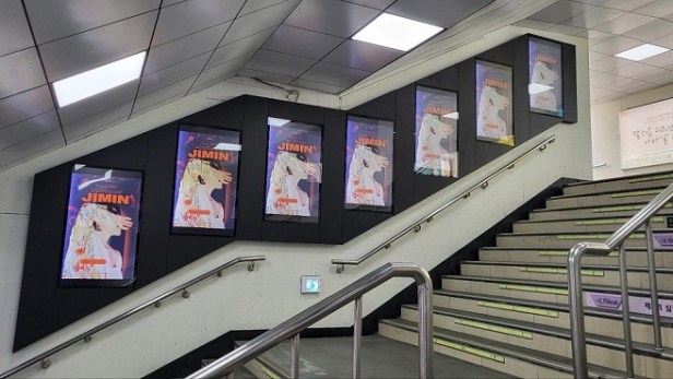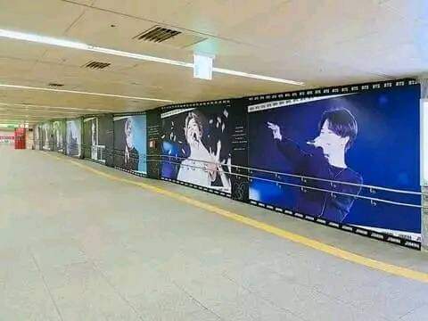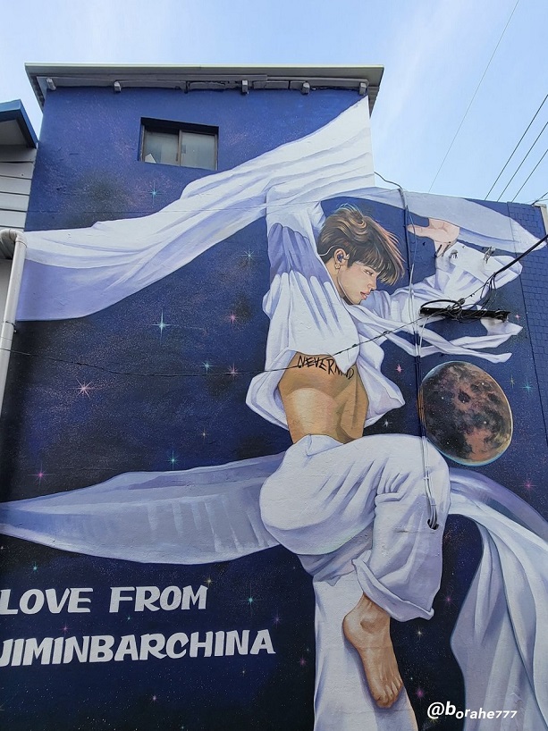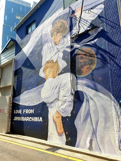 Oltre ai vari cartelloni pubblicitari apparsi fuori alla HYBE, anche un bellissimo murale immortala l’artista durante una delle sue coreografie più spettacolari “I need you” agli MMA.