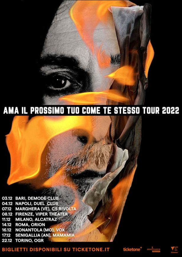 “Non vedo l’ora di incontrarvi tutti, con la testa non ho mai smesso… con la testa sono in tour da questa estate. Sono impaziente di suonare i miei pezzi nuovi ma anche di farvi sentire un sacco di canzoni che conoscete con una nuova energia. Ho molta molta molta voglia. Manca pochissimo” afferma Manuel Agnelli. Il tour di Manuel Agnelli prodotto da Vertigo e lanciato in occasione della presentazione del suo album, il primo da solista “Ama il prossimo tuo come te stesso”. Il disco, uno dei progetti più attesi dell’autunno, uscito lo scorso 30 settembre e preceduto dai singoli ‘Proci’, ‘Signorina Mani Avanti’, ‘Pam Pum Pam’ e dal pluripremiato ‘La profondità degli abissi’, (dalla colonna sonora del film ‘Diabolik’ dei Manetti Bros) è disponibile su tutte le piattaforme digitali (https://island.lnk.to/amailprossimotuo) ed è acquistabile nei formati esclusivi: CD autografato, LP autografato, LP colorato. In contemporanea alla pubblicazione dell’album è uscito anche il singolo “Milano con la Peste”. I quattro brani sono stati presentati nel corso tour estivo e accolti con grande entusiasmo dal pubblico che, dal 3 dicembre, potrà finalmente ascoltare dal vivo l’intero progetto: in scaletta non mancheranno i grandi classici firmati Afterhours. Manuel sarà affiancato ancora una volta dalla band che già lo aveva accompagnato questa estate: Frankie e DD dei Little Pieces of Marmalade rispettivamente alle chitarre e batteria, Giacomo Rossetti dei Negrita al basso e Beatrice Antolini cantautrice e polistrumentista al pianoforte, synth pad e basso.
