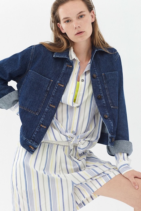 I tessuti scelti sono il tencel fluido e opaco per il trench strutturato color kaki, nella texture a resca con effetto stropicciato ed irregolare. In questi toni troviamo anche la rinnovata proposta del denim, rivisitato nel colore grigio con lavaggio ”stone” a freddo che crea una tela sbiadita e tridimensionale. L’aspetto più polveroso ed etereo dei capi tinti naturalmente, cede il passo alla luminosità dei toni freschi dei rasi di seta e al beachwear da indossare anche per dei look sofisticati e ricercati.