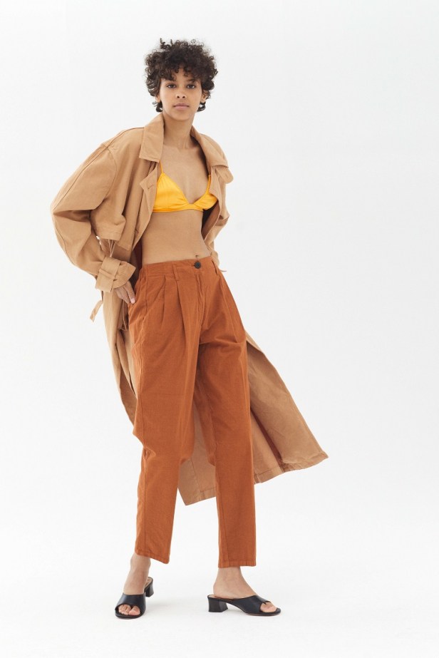 Questi capi tecnici vengono affiancati dai kimono e shorts in raso di viscosa, sull’ ispirazione di un pijama chic. La tuta a palazzo gialla sceglie, invece, il raffinato ed elegante shantung in lino increspato.