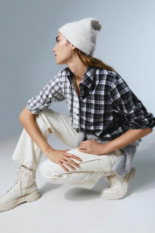 In questa capsule Stradivarius recupera uno dei capi più caratteristici del grunge: la camicia a quadri, perfetta da indossare aperta su maglieria, pantaloni bianchi flare e stivali della stessa gamma di colori.