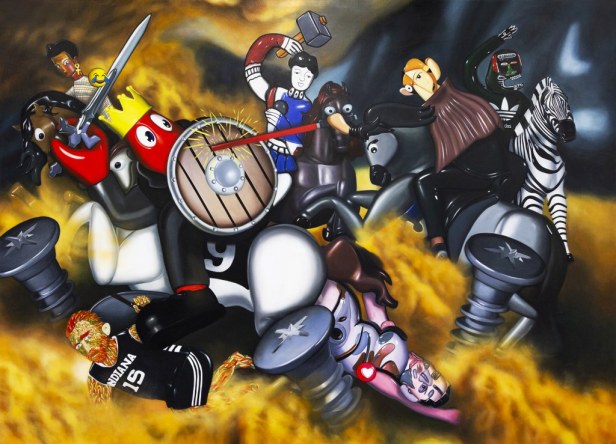 L’altra parte dell’esibizione è invece dedicata ad una selezione di opere pittoriche, tele multistrato in olio dai colori forti, che raccolgono immagini pop riconoscibili in tableaux pieni di ironia.