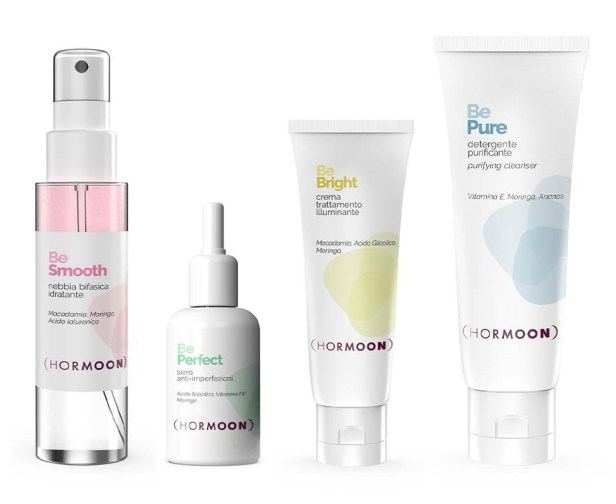 Hormoon è la prima linea di skincare 100% Made in Italy che sincronizza la cura della pelle con le fasi ormonali femminili, partendo dal ciclo mestruale. Due prodotti (detergente e crema trattamento) possono essere usati sempre, gli altri due, specifici in base alla fase in cui ci si trova, permettono di effettuare una skincare routine semplice, ma del tutto completa ed in linea con il trend di rituale minimalista nel rispetto della sostenibilità ambientale. Tutti i prodotti hanno ingredienti di origine naturale, non contengono sles, no siliconi, sono cruelty free e usando vetro, plastica riciclabile e carta FSC, sono inoltre sostenibili. In tutti i prodotti è presente la Moringa, ingrediente di linea; si tratta di una pianta “miracolosa” per la sua azione fortemente antiossidante e antipollution che dona una protezione costante dall’inquinamento atmosferico e una preventiva antiaging. Per ogni prodotto – avendo un utilizzo specifico in base al periodo ormonale – è stato creato un mix di ingredienti bilanciato che potesse rispondere alle esigenze della pelle in quel determinato periodo.