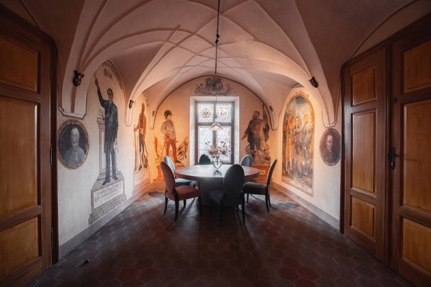 Poi gli spazi interni, con gli affreschi d’epoca a narrare la gloriosa storia della dimora, le calde pannellature in legno del Settecento, una selezione di arredi di design contemporaneo.