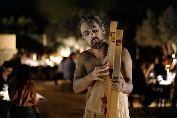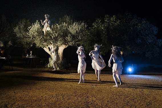 È il Fauno a dare il via allo spettacolo, uno dei personaggi più particolari e affascinanti, che salta dagli alberi con la sua agilità caprina e sorprende gli ospiti durante la cena. Non è solo, con lui le bellissime ninfe, i suonatori di antichi strumenti musicali, le baccanti seguaci di Dioniso vestite di pelli ferine. Tra una scena e l’altra si servono le portate ispirate all’antica cucina greca, mentre tra i commensali si aggirano i personaggi che fanno dello spettacolo un’esperienza ogni volta unica e coinvolgente.