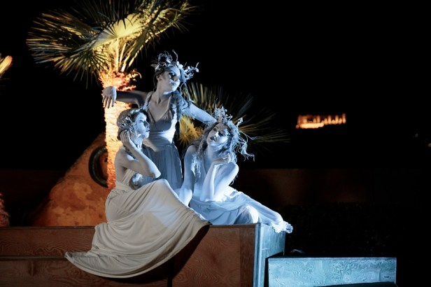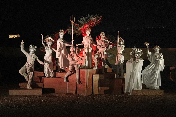 Ma le luci che letteralmente catturano e incantano sono quelle della Via Sacra, dalTempio di Giunone, al Tempio della Concordia fino al Tempio di Ercole, che emergono distintamente dalla valle che si estende appena oltre la scena. In questa atmosfera straordinaria rivivono gli antichi miti greci: il pomo della discordia, lo struggente dramma di Dafne e Apollo, il duello di Ettore e Achille e altri ancora, attraverso una rappresentazione che immerge lo spettatore in un altro mondo, quello ancestrale degli dei.