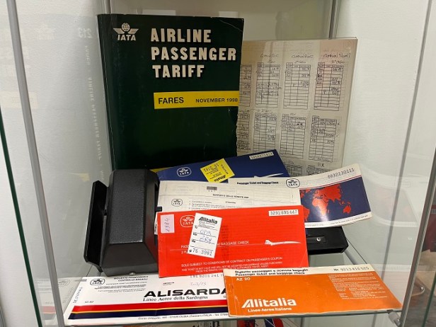 Tra i percorsi tematici più curiosi, una menzione speciale va sicuramente a quello incentrato sulla storia della biglietteria. All’interno della sala si possono trovare biglietti di ogni tipo e i manuali delle diverse compagnie per il calcolo delle tariffe in base alle miglia. Prima degli anni ’80, un agente di viaggio esperto impiegava circa quindici minuti per calcolare la tariffa di un volo diretto Milano – New York, ma poteva volerci fino a un’ora di tempo per le tratte più complesse comprensive di uno o più scali. Una volta calcolato l’importo e verificata la disponibilità, il biglietto veniva emesso con macchine speciali, che le agenzie abilitate ricevevano direttamente dalla IATA (Associazione Internazionale del Trasporto Aereo) per poi essere etichettato con una targhettatrice che apponeva su di esso il marchio dell’agenzia e il logo della compagnia aerea, rendendolo valido per l’imbarco. Con l’avvento dei primi automatismi basati sui GDS (Global Distribution System), negli anni ’80 il modo di emettere i biglietti cambia completamente: la mostra ripercorre questa evoluzione arrivando fino agli “E-ticket” di oggi.