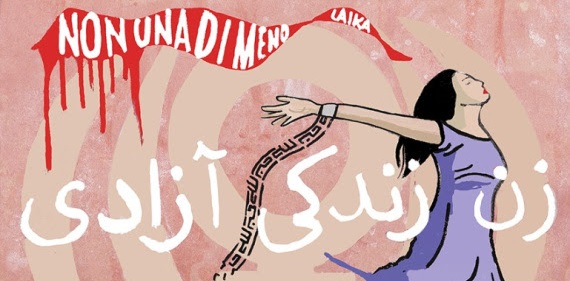 Sullo sfondo lo stemma della Repubblica Islamica “stravolto” dal simbolo delle donne.