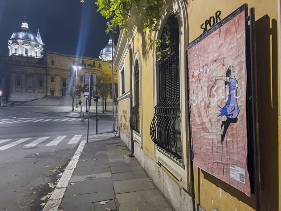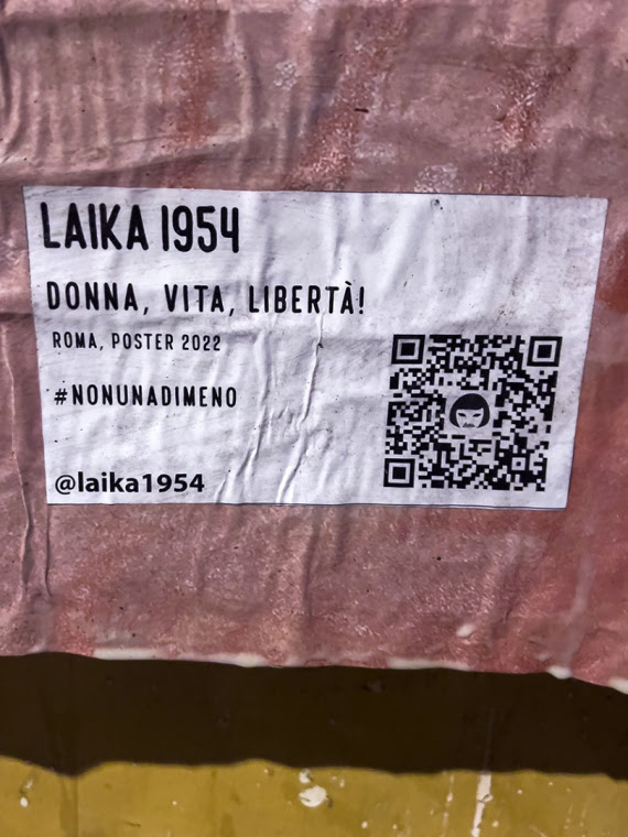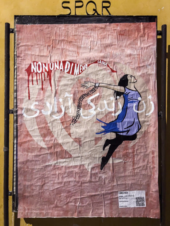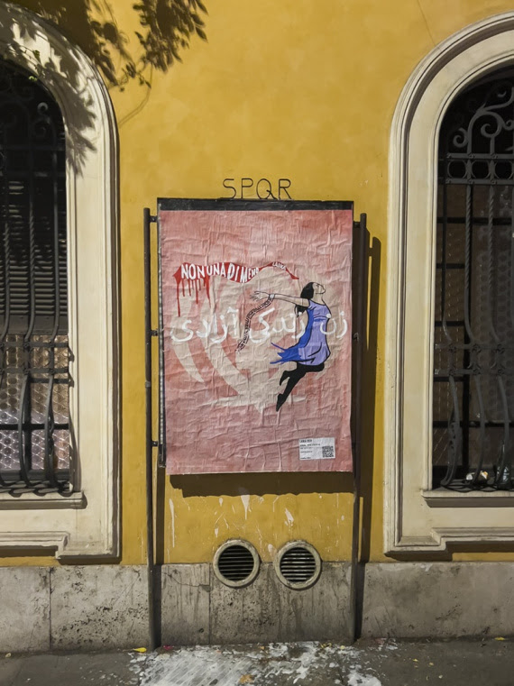 “Ho scelto questa data per dire la mia su ciò che accade in Iran, per supportare le donne che lottano contro il regime islamico, per la loro libertà, a costo della vita. Ho simbolicamente affisso l’opera lungo il percorso della manifestazione nazionale, del 26 novembre, organizzata dal movimento ‘NON UNA DI MENO’ per dedicarla a tutt* coloro che scendono in piazza. Non c’era cornice più adatta” ha dichiarato la street artist.