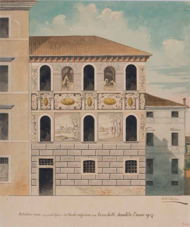 Poco più che ventenne partecipò, nel 1883, assieme a Luigi Bailo, Augusto Serena e a Girolamo Botter, al salvataggio del ciclo ad affresco con le Storie di sant’Orsola di Tomaso da Modena – oggi esposto nel Museo Santa Caterina – che rischiava di andar perduto per sempre con la demolizione della chiesa di Santa Margherita. Ad Antonio Carlini si deve poi l’ampia documentazione dell’urbs picta: i suoi fogli, conservati presso la Biblioteca “Giovanni Comisso” di Treviso, realizzati su commissione del Bailo, ci consentono di conoscere la consistenza, i temi, i colori di molte facciate dipinte della città medioevale e rinascimentale, oggi perduti.