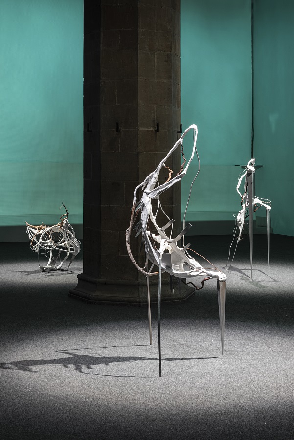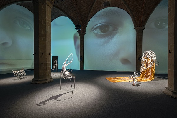 Camilla Alberti schiera così al centro dello spazio un esercito di sculture, creature ibride e aliene immaginate per sopravvivere ai confini della realtà, che si inseriscono all’interno di una ricerca che combina l’osservazione delle rovine contemporanee all’immaginario mitologico e fiabesco dei mostri. In The Adoubement: Ceremony for Extremophile Bodies (La Vestizione: cerimonia dei corpi estremofili). Attraverso un processo di ‘archeologia urbana’, l’artista recupera oggetti abbandonati o scarti industriali per assemblarli insieme a elementi naturali (come arbusti e tronchi) e ad altri materiali (tra cui alluminio e gesso) creando figure stranianti, affilate e intricate, allo stesso tempo respingenti ma affascinanti, che procedono non curanti della nostra presenza. Sempre negli spazi dell’antica armeria di Palazzo Vecchio, Anouk Chambaz presenta una videoinstallazione dal titolo Le Sentinelle, undici ritratti di bambini posti alla guardia di un tesoro misterioso, immersi in un silenzio a tratti assordante. Come personaggi di frontiera i bambini sono i guardiani del nostro futuro e nella loro calma ci osservano, rivolgendo i loro volti al presente. Stanno, resistono, manifestano e urlano. È difficile rimanere indifferenti, il loro sguardo innocente diviene sovversivo, pronto a sfidare i confini definiti dagli adulti per entrare nell’ambito del magico oltre la razionalità, immaginando e pretendendo un Futuro.