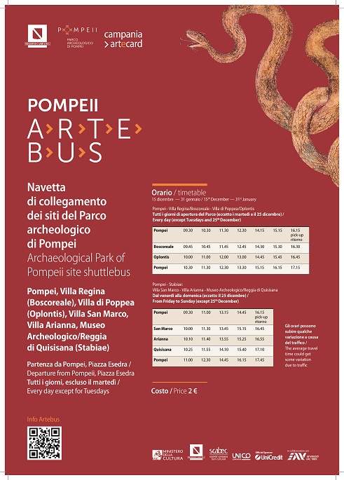 Riparte oggi, 16 dicembre, POMPEII ARTEBUS, la navetta ideata per i visitatori del Parco archeologico di Pompei che renderà più agevole il collegamento tra i vari siti gestiti del Parco: da Pompei alla villa rustica di Boscoreale, Villa Regina, alle ville nobiliari di Oplontis, Villa di Poppea e di Stabia, Villa Arianna e Villa San Marco, fino al Museo archeologico di Stabia “Libero D’Orsi” presso la Reggia di Quisisana.