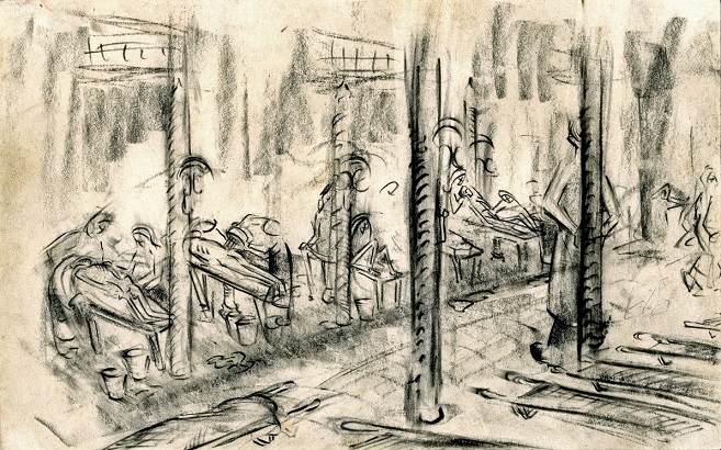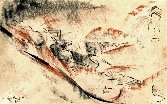 Seguono poi alcuni disegni originali eseguiti sul posto e altri presenti solo in riproduzione, a cui si aggiunge un bronzo realizzato prima della guerra insieme a un paio di dipinti degli anni successivi, a mostrare la rapida e radicale trasformazione dell’arte di Congdon dopo i traumatici eventi vissuti durante il conflitto.