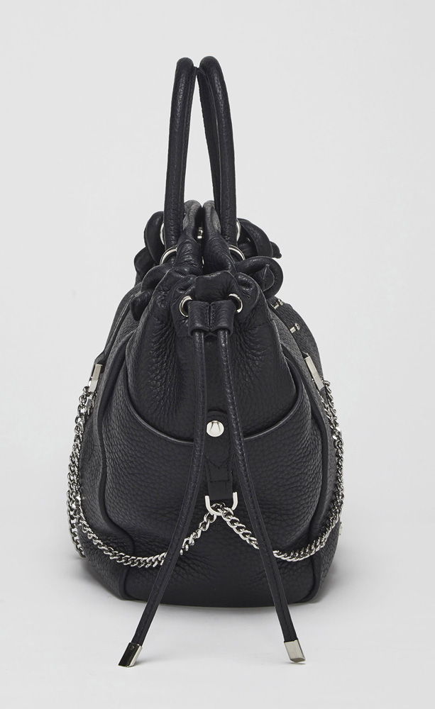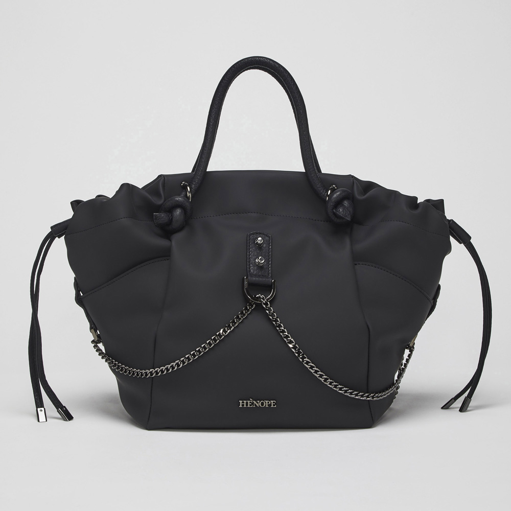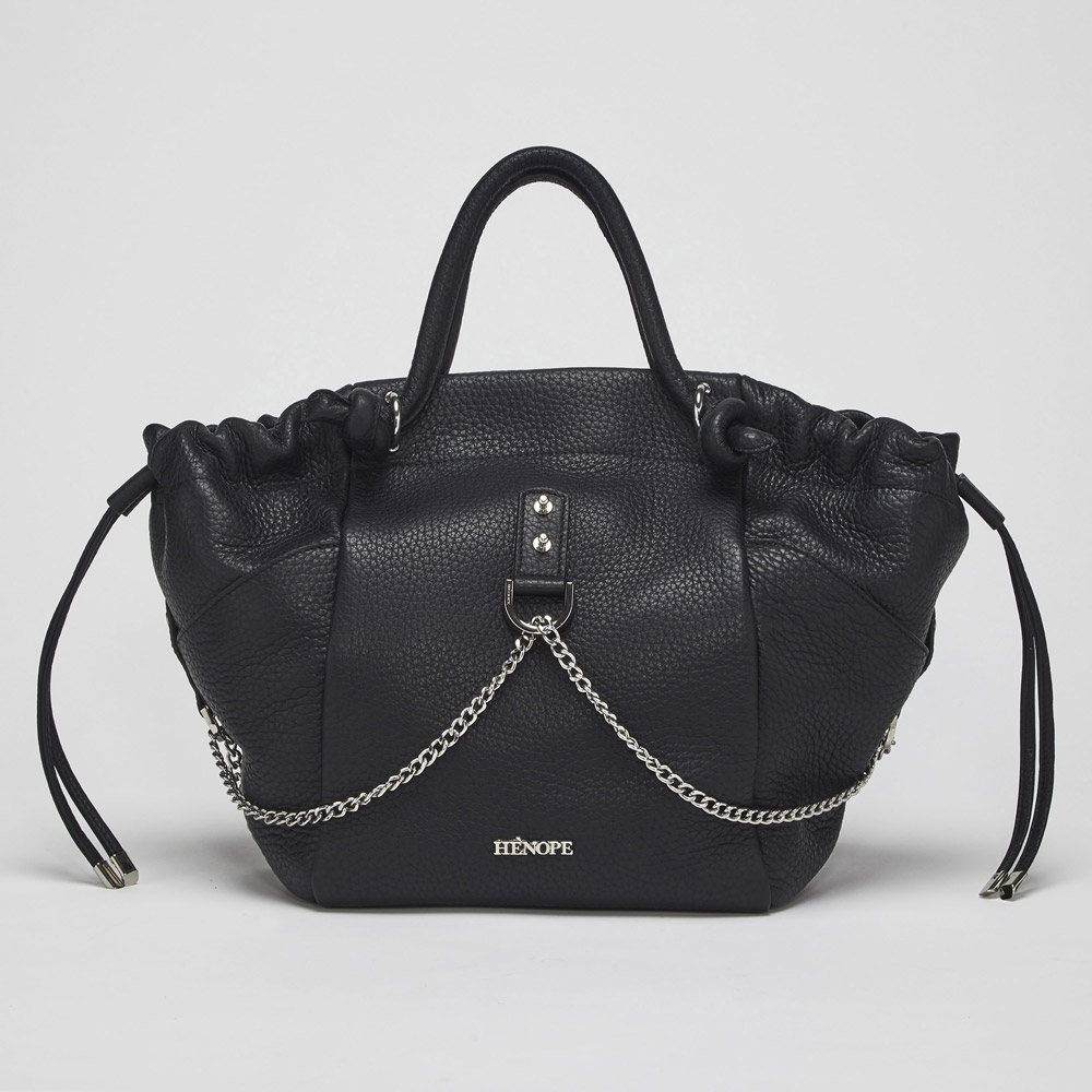 Nata per farsi notare sia di giorno che di sera, è una handbag dalle dimensioni contenute e dalla forma a trapezio addolcita e plasmabile attraverso due coulisse. È caratterizzata da quattro mezzelune di metallo che permettono il passaggio di una catena decorativa, tocco improvviso di luce ed energia.