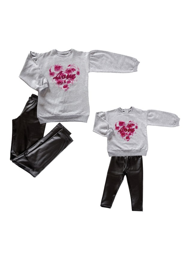 Per iniziare un capo super alla moda firmato Premamy e Baby Vip: i leggings in ecopelle, perfetti da abbinare alla t-shirt a manica lunga e maxi-stampacon sneakers e scritta “Tale mamma… Tale figlia!” o alla felpa grigia con stampa rossa a cuore.