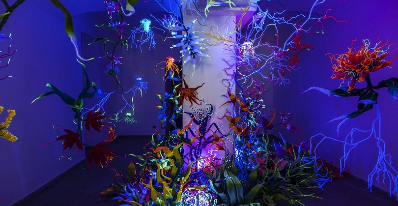 Iocari serio è l’installazione di Federica Patera (Bergamo, 1982) e Andrea Sbra Perego (Bergamo, 1982), realizzata da tessuti rigenerati da bottiglie di plastica PET, forniti da CARVICO S.p.A . L’opera mutua il titolo dall’omonimo libro di Ioan Petru Culianu, innovativo storico delle religioni del Novecento, e ha nel gioco la sua cifra formale mentre conduce l’osservatore muovendo da un passaggio del testo letterario attraverso il racconto del legame verbale tra il sole e una delle sue teofanie più antiche, il cigno. La comune radice indoeuropea si articola in una successione ramificata di vocaboli in cui valore simbolico e semantico evolvono da un idioma all’altro fornendo una mappa tridimensionale accogliente e giocosa della pluralità di elementi generati da un’unica matrice. Il percorso approda infine a Transition, l’installazione immersiva di Elham M.Aghili (Sassuolo, 1989) che ha la sua cifra nelle forme ibride in bilico tra la vita sommersa marina e la vegetazione emersa terrena. Amplificando le sembianze di una natura percepita che si prende gioco dei nostri sensi e accentuando il contrasto della sua relazione con ciò che le è estraneo, la decontestualizzazione di un piccolo campione che allude all’esperienza del selvatico e dell’addomesticato assume qui un valore simbolico. Mentre terra e mare si ibridano in nuove forme dai confini sfocati, l’opera si interroga sui limiti della nostra percezione, fra reale e virtuale, fra la concretezza della vita materiale e la sua stessa illusione.