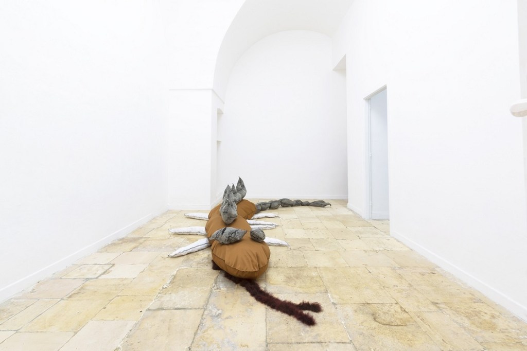 Il progetto “FIBERSTORMING”, curato da Barbara Pavan, viene declinato negli spazi della Fiera di Bergamo in un percorso di otto macro installazioni collocate poco oltre l’ingresso e racchiuse sotto l’unico titolo di INFERNOPARADISO. Saranno le opere di Elham M.Aghili, Mariantonietta Bagliato, Michela Cavagna, DAMSS, Lucia Bubilda Nanni, Guido Nosari, il duo Federica Patera e Andrea Sbra Perego, Elena Redaelli a raccontare una pluralità di significati e di interpretazioni di inferno e paradiso, in una crasi ortografica che rispecchia l’ambiguità di ogni definizione assoluta. Così come la classificazione di bene e male è suscettibile di una diversa valutazione a seconda della cultura e dell’epoca che la esprime, il luogo in cui l’uno trova il suo premio e l’altro la sua espiazione assumono forme e rappresentazioni differenti nella diversità di religioni, miti, tradizioni e letterature, non meno che nel punto di vista da cui si osserva un qualunque singolo evento o fenomeno condizionandone il giudizio individuale: una palude è un paradiso per le zanzare, un inferno per gli esseri umani. In un percorso che si muove lungo il crinale incerto e indefinito tra gli opposti, il visitatore attraversa questa terra di mezzo, ibrida, multiforme e stratificata. Nasce dalla ricerca artistica influenzata da un immaginario che trae le sue origini dal teatro di figura il Serpendrillo di Mariantonietta Bagliato (Bari, 1985), creatura fantastica a metà tra un coccodrillo e un serpente, animali ricchi di riferimenti simbolici e mitologici. Al pari del coccodrillo, questa creatura è sopravvissuta ai diversi cambiamenti climatici adattandosi per sopravvivere anche in una immaginaria era post-umana dominata dai deserti e, come il serpente,evoca il perenne avvicendarsi del ciclo della vita. Alle tracce di questo scorrere del tempo fa riferimento anche Quasi-static, l’opera di Elena Redaelli (Erba,1981) in cui masse di aggregati di polpa di carta e lana sono mantenuti assieme in modo più o meno stabile,mostrando una trasformazione impercettibile, quasi statica, dove gli stati di sviluppo intermedi sono prossimi all’equilibrio di corpi tendenti verso la vera metamorfosi.