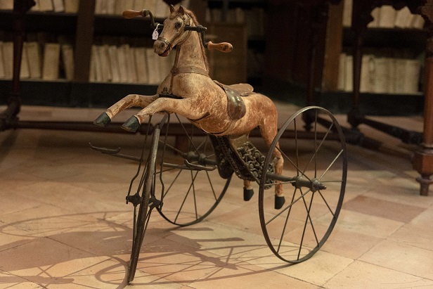 Inquietanti, poi, i giocattoli “di regime”, fra gli anni ’30 e ’40, con i bambolotti e il Pinocchio Balilla, strumenti di propaganda nelle fasce più giovani della popolazione dell’epoca – propaganda a iosa – e un’auto scoperta di latta, una Mercedes del 1936, dove, a bordo, si riconosce nitidamente Adolf Hitler, accompagnato da alcuni gerarchi, in cui uno ha il braccio teso nel saluto nazista.