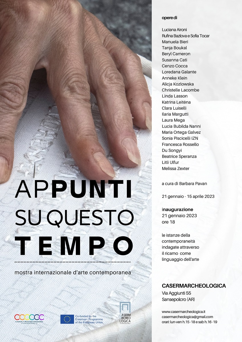 CASERMARCHEOLOGICA inaugura sabato 21 gennaio 2023, alle ore 18:00, nella sede di Sansepolcro (via Aggiunti, 55, provincia di Arezzo) la mostra internazionale APPUNTI SU QUESTO TEMPO, con opere di ventiquattro artiste e artisti attivi sulla scena contemporanea e provenienti da diversi paesi del mondo curata da Barbara Pavan e visitabile fino al 15 aprile 2023.L’inaugurazione sarà preceduta alle ore 17 daun incontrodal titolo”La sostenibilità ambientale nell’arte tessile“inserito nel progetto Erasmus+C6 vinto da CasermArcheologica, dedicato ai temi dell’ambiente e della creatività.