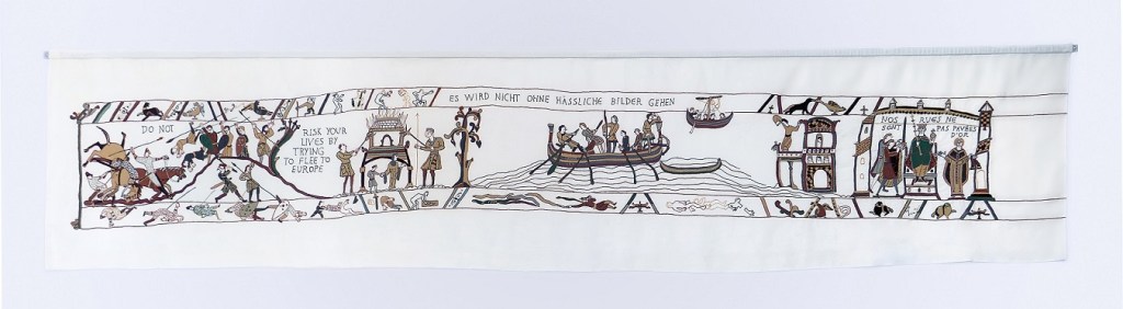Da queste premesse è nata questa mostra che, come recita il titolo, è un’esplorazione del nostro tempo, delle sue contraddizioni, delle sue vittorie e delle sue sconfitte; un racconto affidato ad ago e filo e restituito all’osservatore attraverso il talento di artisti impegnati ad indagarne le luci e le ombre, ad affrontarne le sfide e a leggerne le molte sfumature. Dalla resistenza politica ai nuovi equilibri tra esseri umani e natura, dai flussi migratori alla propaganda, dalla malattia all’identità, dalla guerra al consumismo compulsivo, il ricamo diventa qui, punto dopo punto, il lessico per dar voce alla contemporaneità e per fornirci un punto di osservazione altro della realtà che ci circonda.