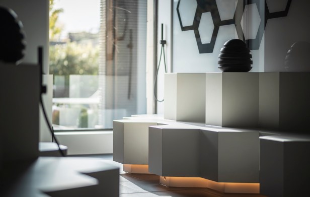 A rendere speciale l’esperienza nel bagno di vapore è anche e soprattutto l’architettura che riflette il favo delle api. Tutto è pensato per far rivivere l’ambiente così com’è in natura. Le tipiche celle esagonali che le api utilizzano per immagazzinare la loro scorta di miele decorano le pareti, ma fungono anche da comode sedute per gli ospiti. La luce tenue che vira al giallo, il profumo dolce e fruttato, la musica di sottofondo che richiama il ronzio delle api: se chiudi gli occhi ti ritroverai immerso in un prato di fiori colorati.
